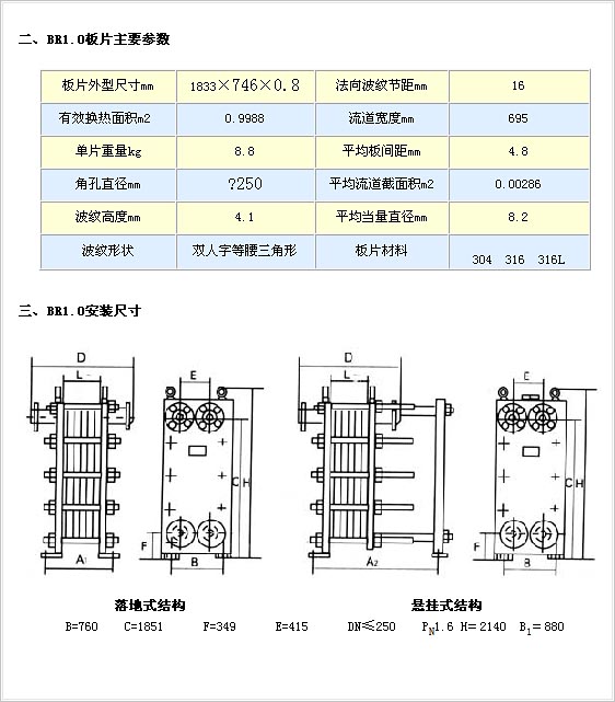 | 淄博市某某換熱設備有限公司專業生產的BR1.0型板式換熱器主要由不銹鋼壓制的傳熱片、密封膠墊、夾緊螺栓和壓緊板整機框架等零部件組成。具有換熱效率高,物料流阻損失小,結構緊湊,溫度控制靈敏,操作彈性大,拆裝方便,使用壽命長等特點,是目前國內最先進的高效節能換熱設備。 BR1.0型板式換熱器可耐各種腐蝕介質,傳熱效率高,冷熱介質通過相鄰板片流經各自通道進行換熱。由于板片上有人字形波紋,介質流動形成湍流, 因此獲得較高的換熱效率。高效節能,傳熱系數高。其換熱系數可達3000-4500kcal/m2.゜C.h.是相同流速下管殼式換熱器的3倍以上。使用安全可靠,結構緊湊,體積小,占地少,是同等換熱面積管殼式換熱器的五分之一左右。 BR1.0型板式換熱器組合靈活,調整維修方便,松開壓緊螺母即可進行清洗維護(可參考板式換熱器設備清洗要點),更換膠墊或板片。板式換熱器板片均為獨立元件,可按用戶要求隨意增減換熱面積和流程。密封槽設置泄液液道,各種介質不會串通,即使出現泄漏,也是向外排出。 BR1.0型板式換熱器各個部件的功能: BR1.0型板式換熱器訂貨須知: