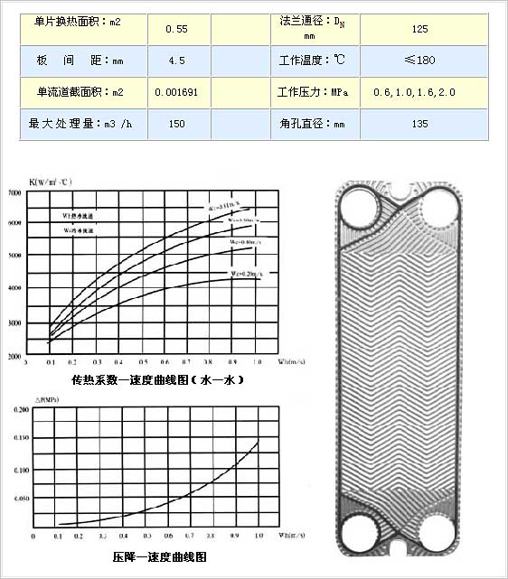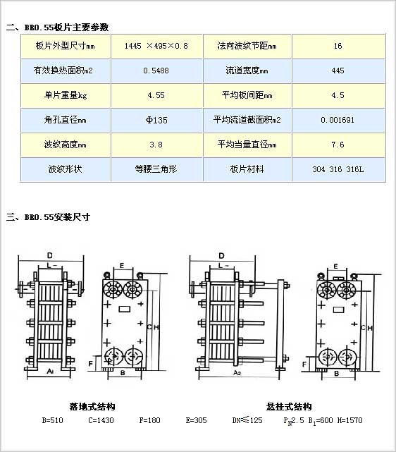 | BR0.55型板式換熱器主要由不銹鋼壓制的傳熱片、密封膠墊、夾緊螺栓和壓緊板整機框架等零部件組成。具有換熱效率高,物料流阻損失小,結構緊湊,溫度控制靈敏,操作彈性大,拆裝方便,使用壽命長等特點,是目前國內最先進的高效節能換熱設備。 BR0.55型板式換熱器可耐各種腐蝕介質,傳熱效率高,冷熱介質通過相鄰板片流經各自通道進行換熱。由于板片上有人字形波紋,介質流動形成湍流, 因此獲得較高的換熱效率。高效節能,傳熱系數高。其換熱系數可達3000-4500kcal/m2.゜C.h.是相同流速下管殼式換熱器的3倍以上。使用安全可靠,結構緊湊,體積小,占地少,是同等換熱面積管殼式換熱器的五分之一左右。 BR0.55型板式換熱器組合靈活,調整維修方便,松開壓緊螺母即可進行清洗維護(可參考板式換熱器設備清洗要點),更換膠墊或板片。板式換熱器板片均為獨立元件,可按用戶要求隨意增減換熱面積和流程。密封槽設置泄液液道,各種介質不會串通,即使出現泄漏,也是向外排出。 BR0.55型板式換熱器常見故障的處理: BR0.55型板式換熱器訂貨須知: